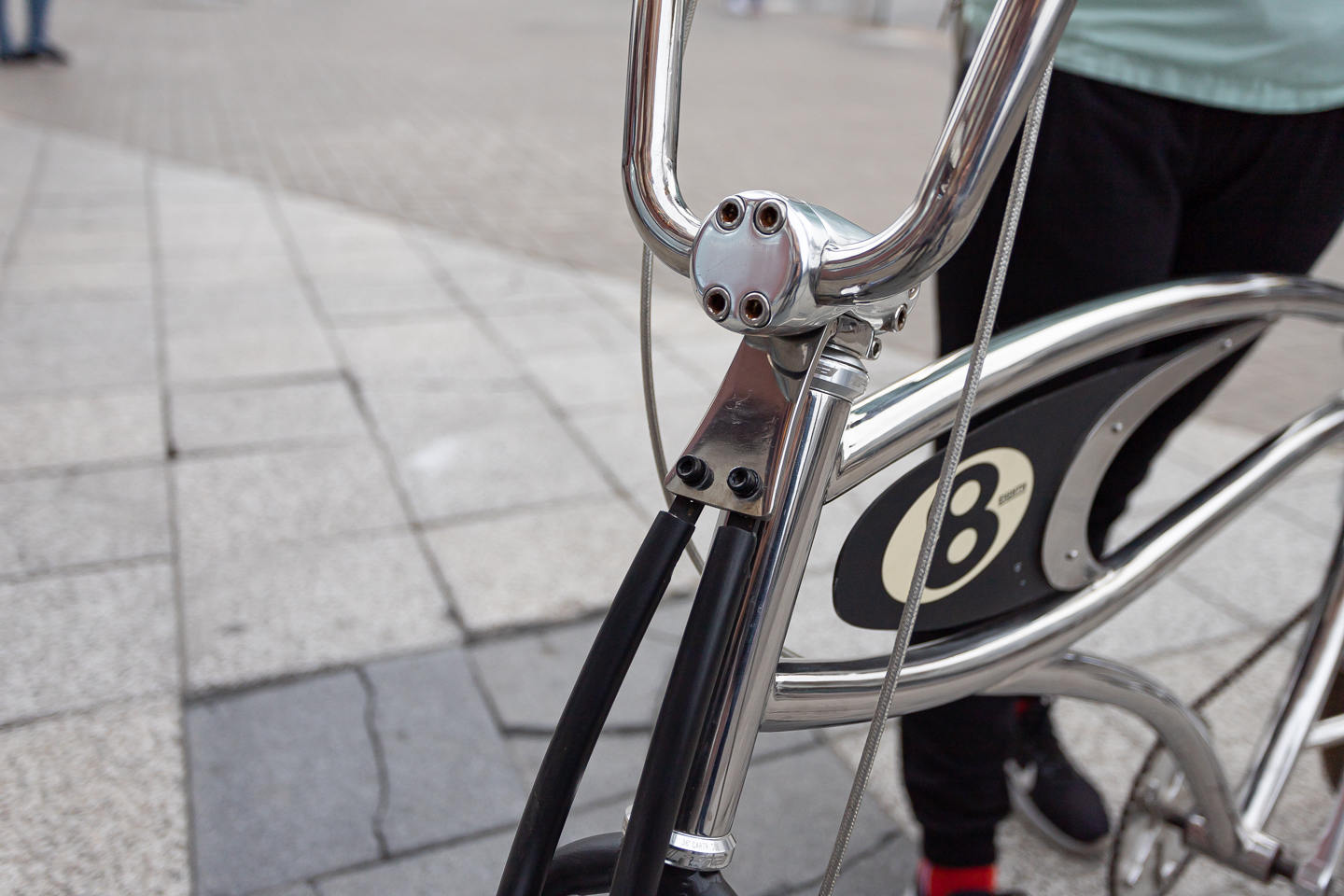 Велосипед действительно неординарный — заметно более длинный, чем обычные модели, с толстыми колёсами, плавными линиями рамы и высоким рулём. Своей формой и металлическим блеском он напоминает мотоцикл.
